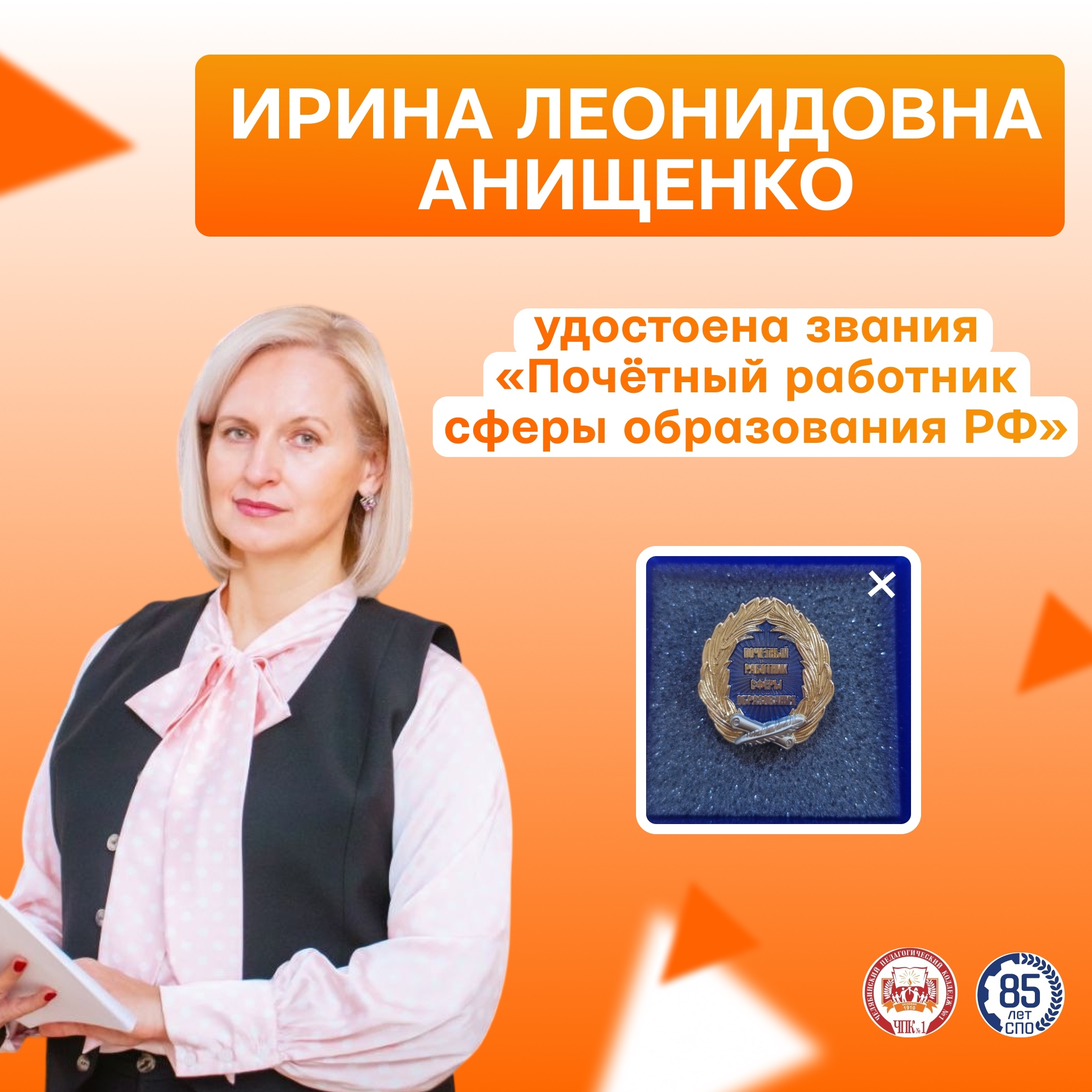 Запускаем юбилейную рубрику «Профессионалы с большой буквы: 115-летие колледжа» С гордостью сообщаем, что в рамках 115-летнего юбилея колледжа Ирина Леонидовна Анищенко, заместитель директора по научно-методической работе, удостоена почётного звания «Почётный работник сферы образования РФ»! Это высокая оценка многолетнего профессионального пути, преданности делу и неоценимого вклада в развитие профессионального образования. Это звание — заслуженное признание достижений! Ирина Леонидовна является примером для коллег и студентов, вдохновляя своим профессионализмом и преданностью делу. Пусть путь будет освещён новыми профессиональными победами!