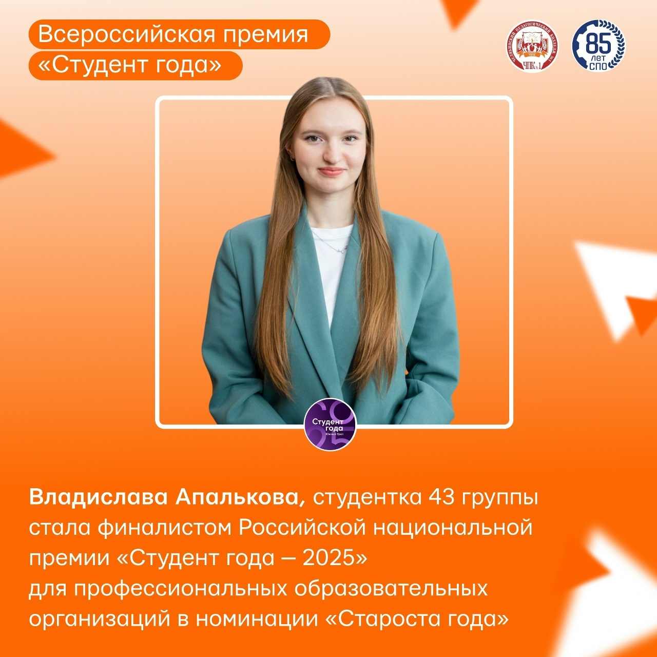 Владислава Апалькова, студентка 43 группы, успешно прошла отборочные этапы и стала финалистом престижной Российской национальной премии «Студент года — 2025» для профессиональных образовательных организаций. Ее выдающиеся качества, лидерские способности и активная жизненная позиция были высоко оценены экспертным жюри в номинации «Староста года». Выражаем Владиславе искреннюю благодарность за ответственность и целеустремленность, которые привели к такому значительному успеху. Желаем ей удачи, уверенности в своих силах и блестящих результатов на всех последующих этапах премии. Пусть этот успех станет мощным стимулом для дальнейших достижений в учебе и общественной деятельности!