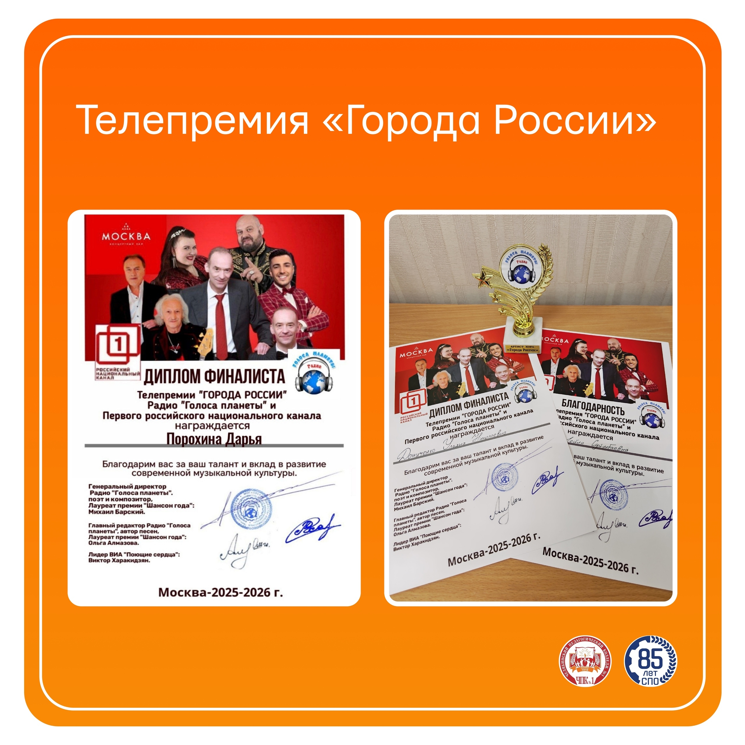 Дарья Порохина и Ульяна Дониченко, студентки музыкального отделения, в сентябре 2025 года подавали заявку на участие в онлайн отборе проекта «Телепремия – Города России». Девушки успешно прошли отбор и уже с 15 по 19 ноября получили возможность принять участие в очном этапе, в городе Москве. Наставник – Лейла Суймбаевна Муталиева, преподаватель музыкальных дисциплин. Участники получили незабываемые впечатления, ценный профессиональный опыт и награды. Поздравляем и желаем дальнейшего профессионального развития.