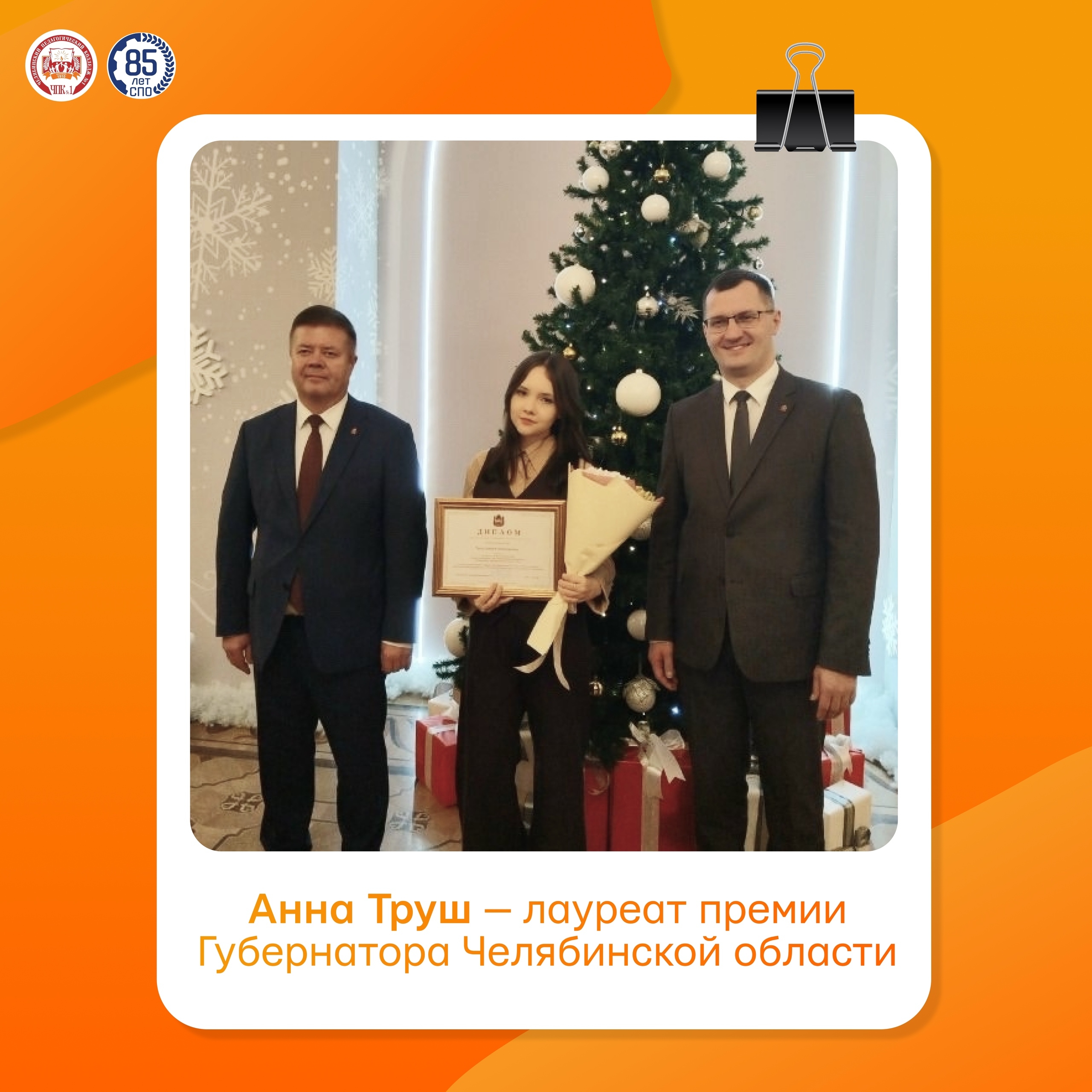 25 декабря в Правительстве Челябинской области прошла торжественная церемония награждения лучших студентов ПОО региона. Анна Труш, студентка 40 группы стала лауреатом премии Губернатора Челябинской области!